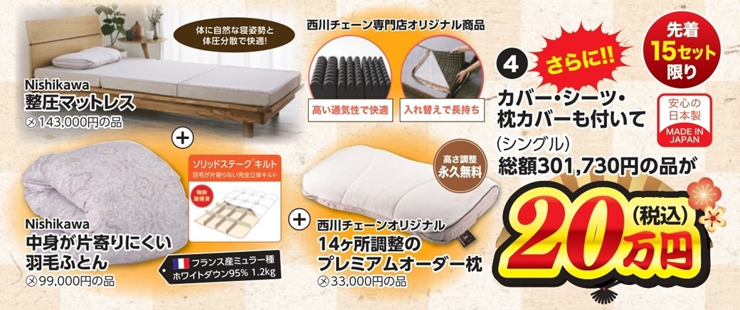 整圧マットレス+片寄り防止キルト羽毛ふとん+プレミアムオーダー枕の豪華セット