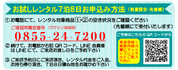 (来店目的・相談内容の欄にマットレスレンタルとご記入ください)