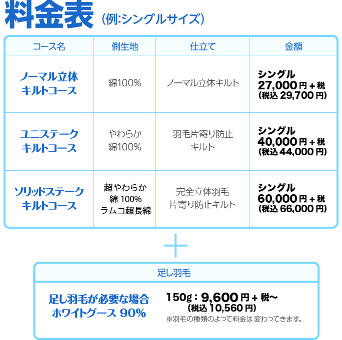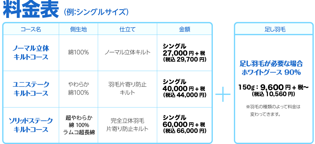 フジシンの羽毛ふとんリフォームでは、側生地の種類と仕立て(キルティング)に応じて3つのコースをご用意しています。