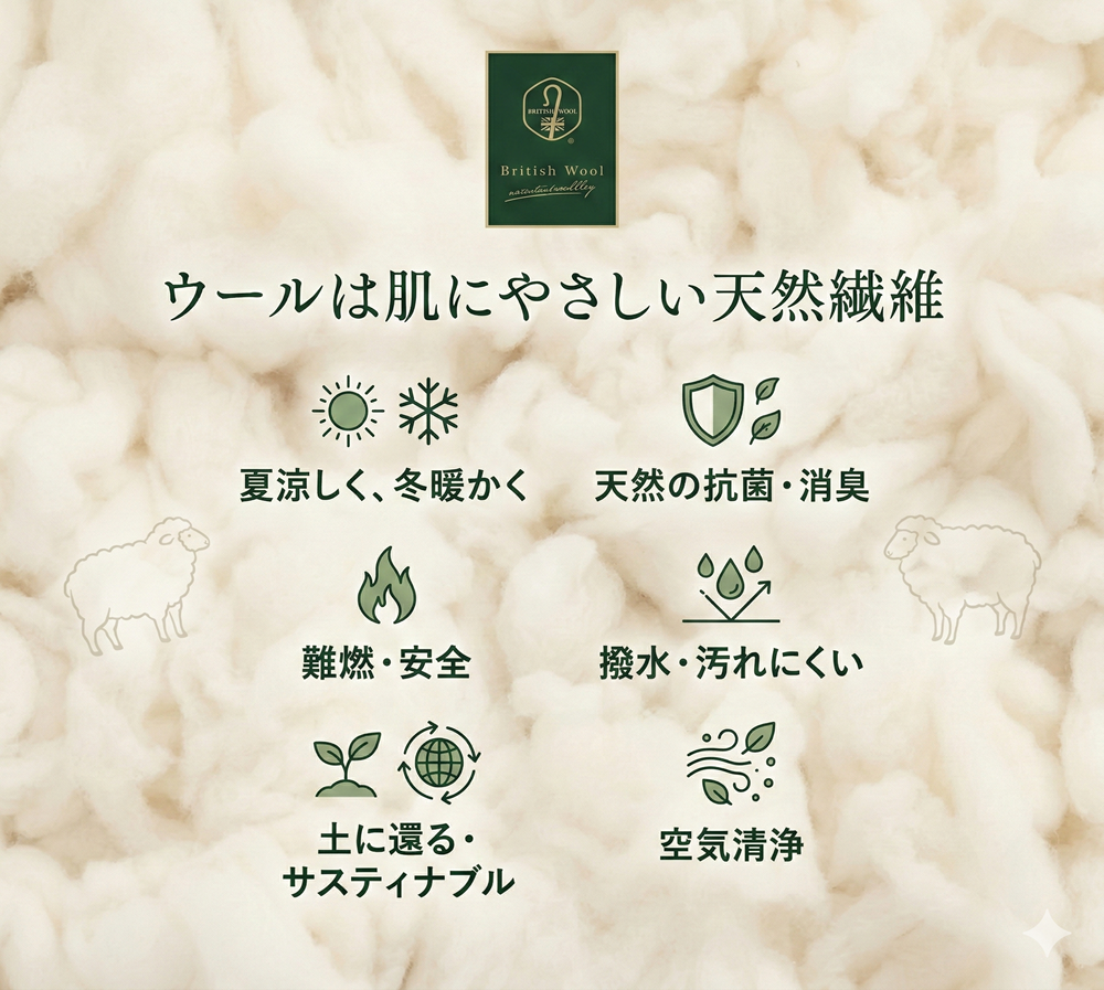 中綿には、人肌に近いタンパク質を持つ天然繊維「ブリティッシュウールを100%」使用。優れた吸湿性・放湿性を持っているため、汗ばむ夏はムレずにサラサラ、寒い冬は体温を逃がさずじんわり温めてくれます。季節の変わり目のお布団選びに悩む必要はもうありません。
