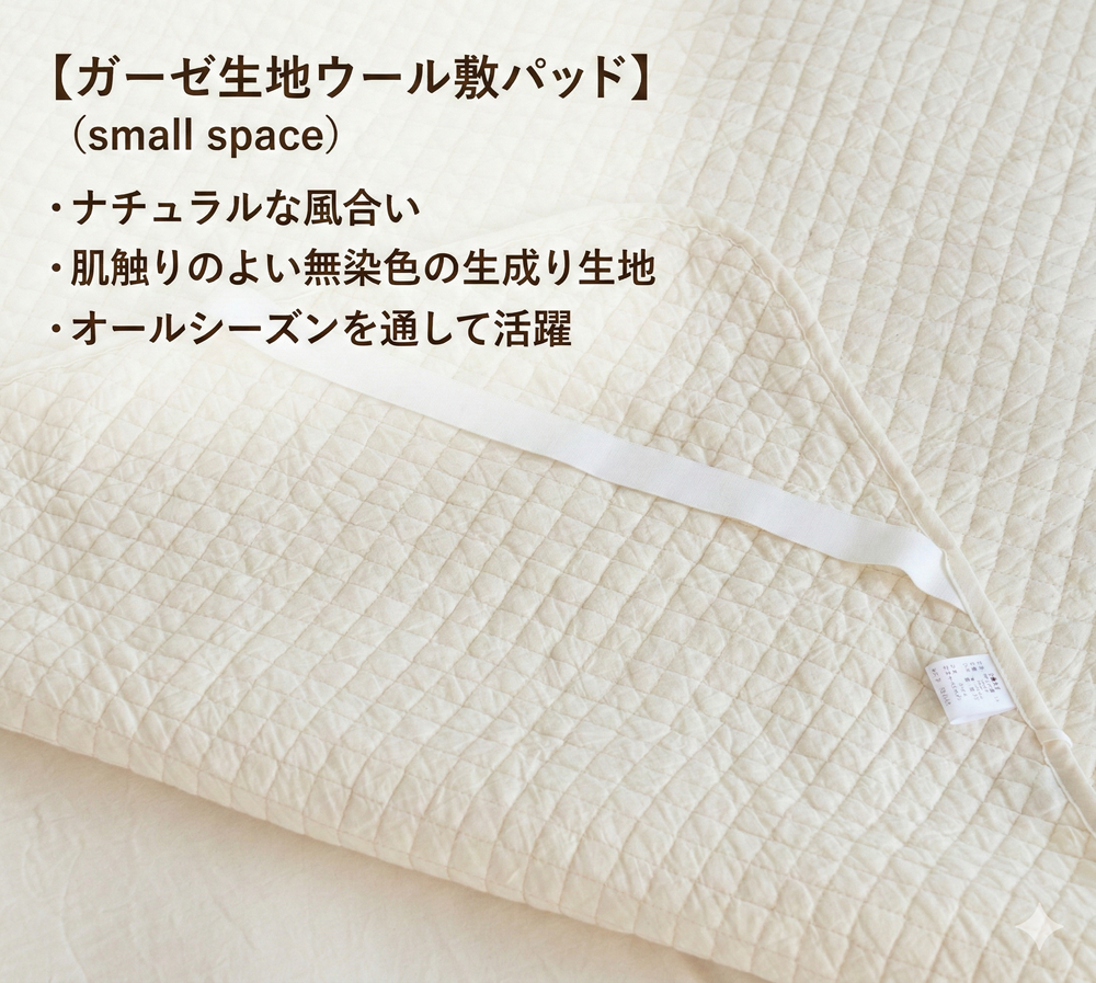 「ウールキルト敷パッド」は、高機能な特殊マットレスをお使いの方にこそおすすめしたい、究極の「引き立て役」寝具です。 ブリティッシュウール100%の天然の調湿パワーと、計算され尽くした絶妙な厚みで、1年中サラッと快適な睡眠環境をお約束します。
