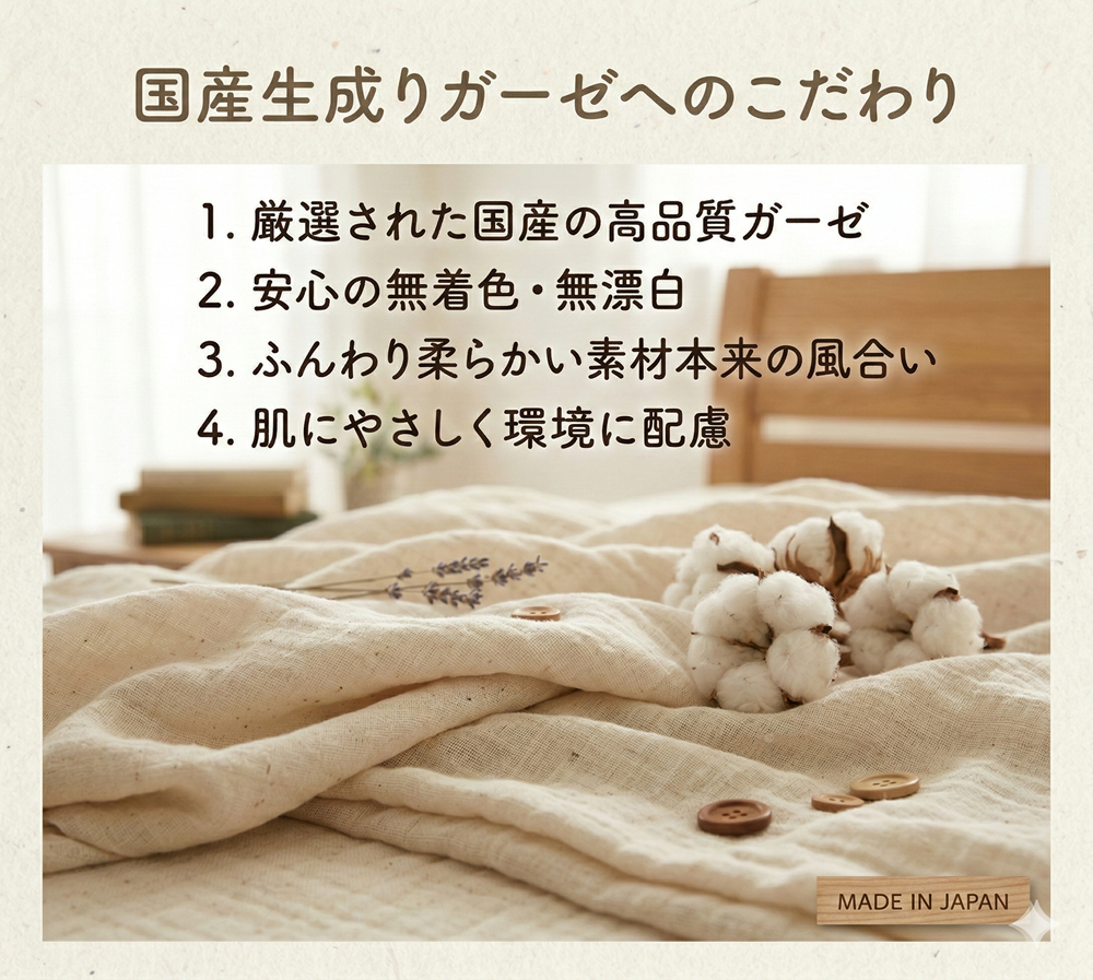 直接肌に触れる側生地には、綿100%の「98本国産織ガーゼ」を採用。 無漂白・無着色(きなり)にこだわり、化学薬品によるストレスを極限まで減らしました。