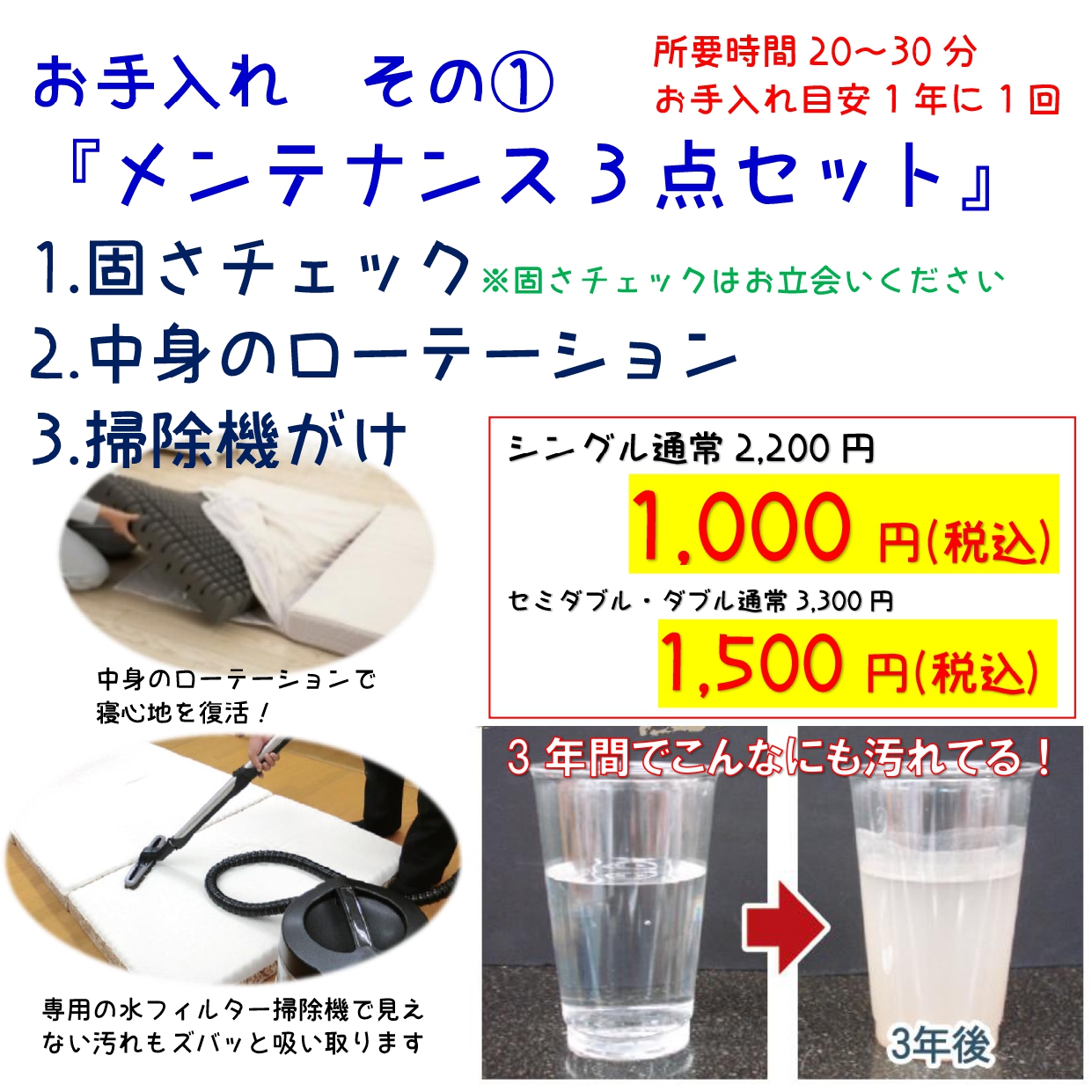 部分的なヘタリチェックをし、3つ折りマットレスはローテーションいたします。見えない汚れも専用の掃除機でズバッと吸い取ります♪