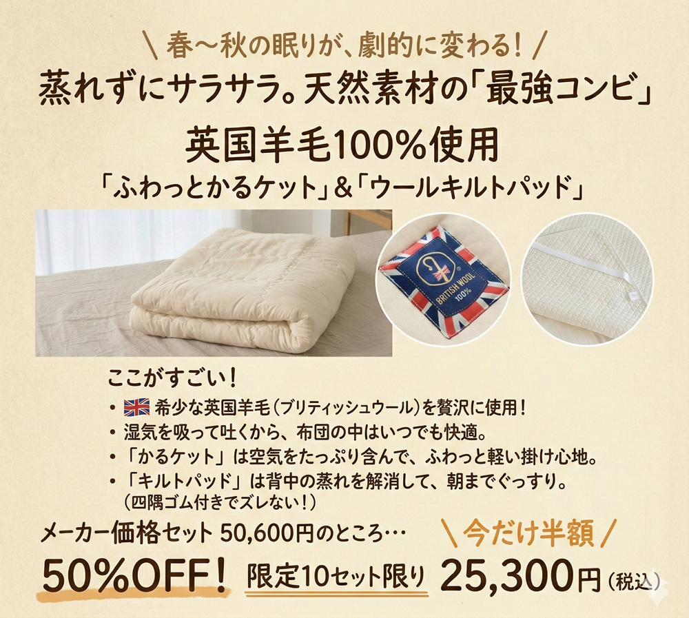 今回、【ふわっとかるケット※単品33,000円】と【ウールキルト敷パッド※単品17,600円】をセットでお買得に!