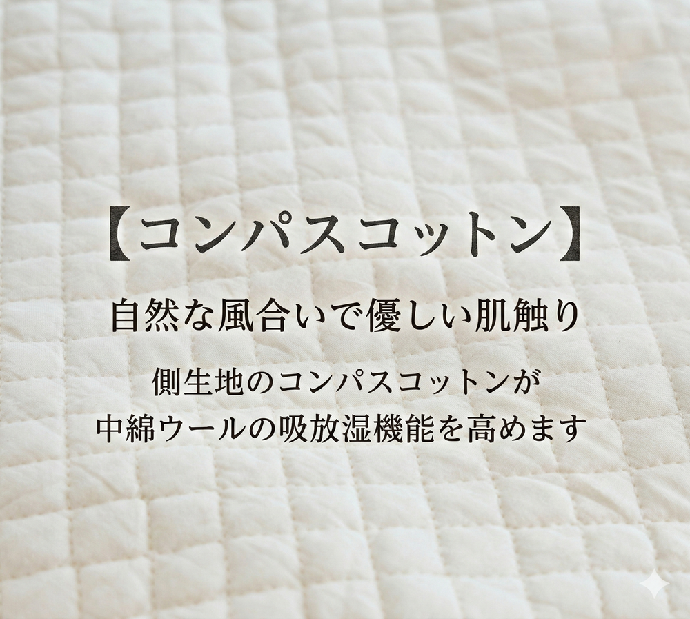 側生地には、肌に優しいインドネシア産「コンパスコットン」を100%使用。漂白や染色を一切行わず、自然のままの生成り(きなり)生地に仕上げました。 これにより、コットン本来の柔らかさが保たれ、中綿のウールの吸放湿性をさらに高めてくれます。 ※生地にある黒い斑点は綿花の種子です。無漂白の証拠であり、お洗濯のたびに落ちていきますのでご安心ください。